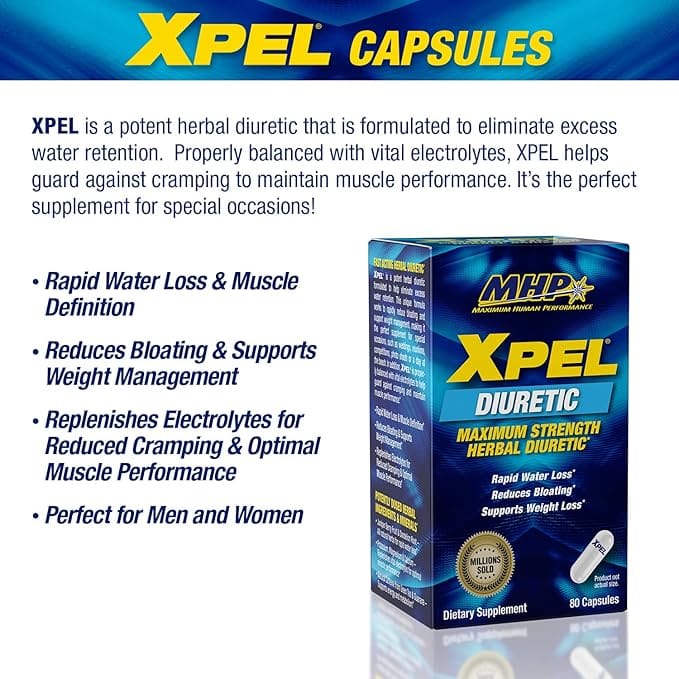 MHP XPEL is a fast-acting herbal diuretic that helps reduce water retention, bloating, and excess water weight for a leaner, more defined physique.
